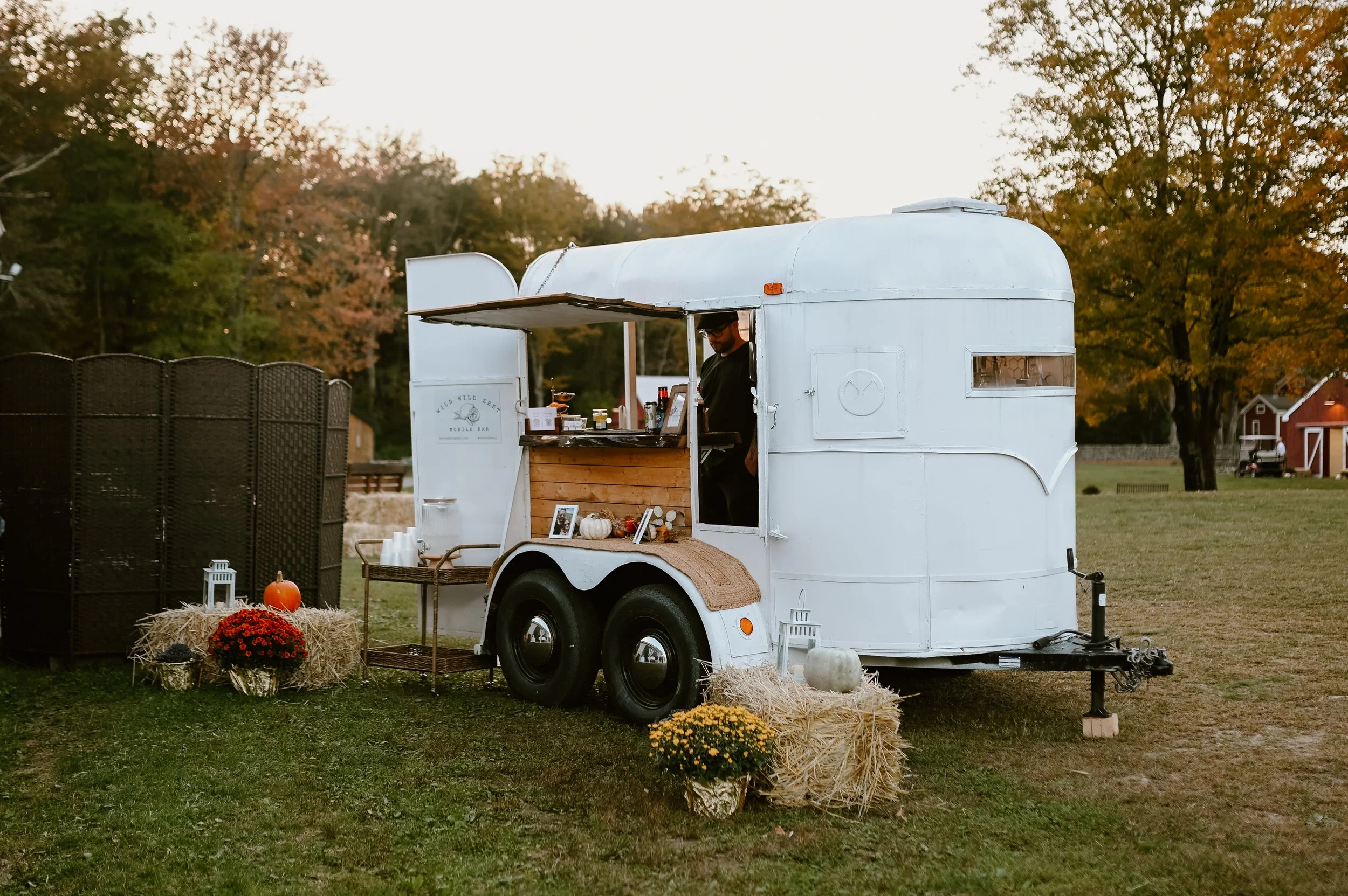 White vintage trailer converted into a bar, with open side window serving area, decor including flowers and greenery, outside on green grass near a lake with houses and trees in the background.